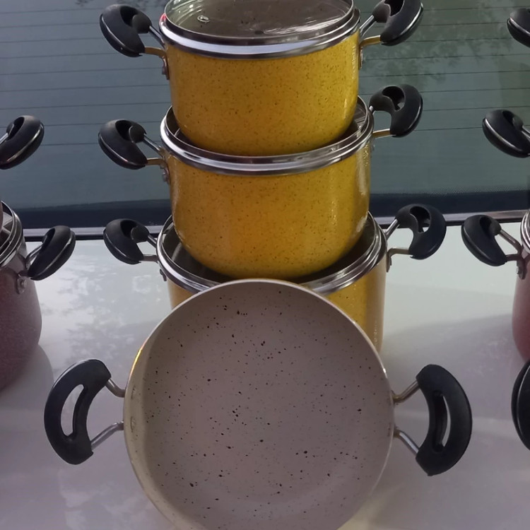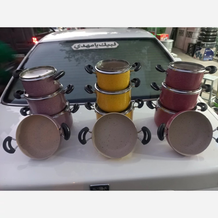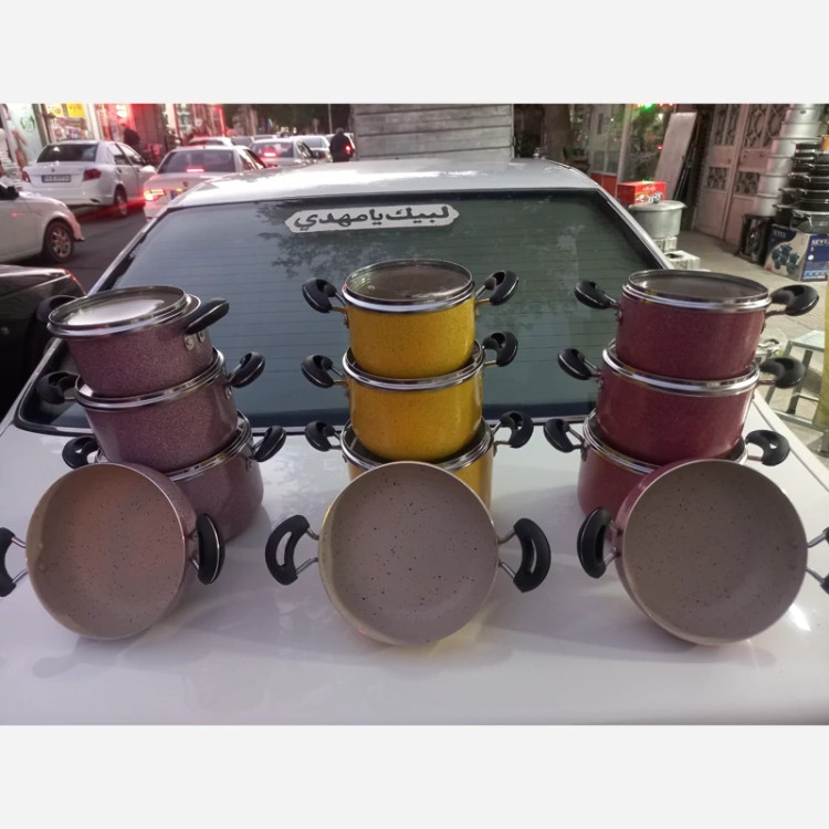 سرویس قابلمه 7پارچه دانشجویی مارک معتبر هلنا شامل 3 عدد قابلمه و یک عدد تابه قابلمه ها سایز 14 و16 و18 و یک عدد تابه 18 جنسشون گرانیتی داخل گرانیت کرم شبیه عکس درب پیرکس قیمت فوق العاده اقتصادی دسته ها نسوز و قابلمه تعویض 3 رنگ زیبا و پر فروش