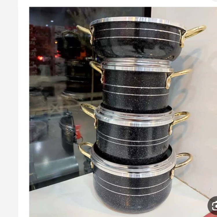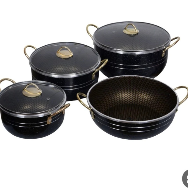 فروش ویژه سرویس 7پارچه زنبوری دسته طلایی دانشجویی مناسب برای 3 نفر قیمت کارخانه جنس ضخیم دارای 3 قابلمه سایز 14و16و18و یک تابه سایز 18